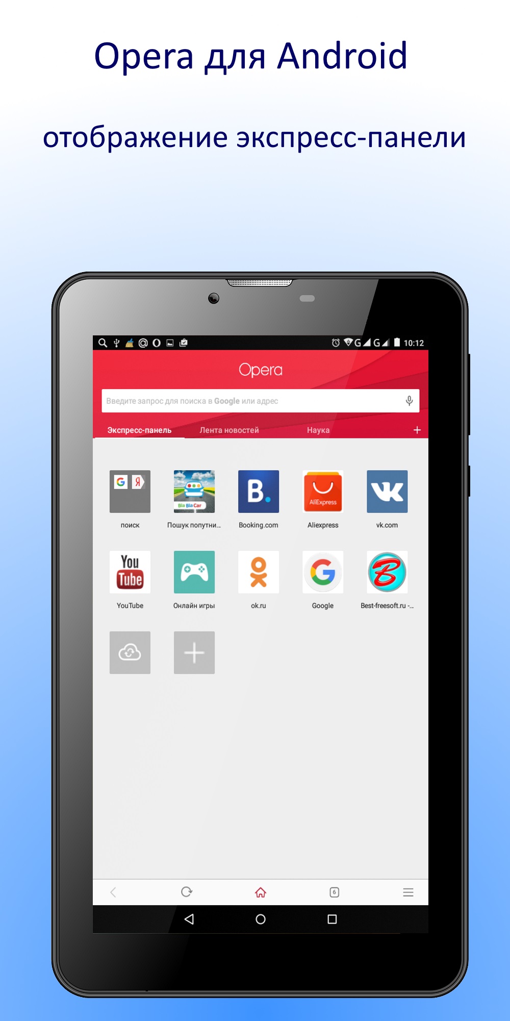 Opera для Android — широко известный интернет-браузер, успешно адаптированный для работы на мобильных устройствах под управлением Android, в котором была реализована поддержка большого спектра веб-стандартов. Удачно конкурируя с такими общепризнанными лидерами как Mozilla Firefox и Google Chrome, Opera по праву входит в топ-3 самых популярных браузеров мира.При первом запуске браузера на мобильном устройстве пользователь попадает на экспресс-панель с набором иконок сайтов по умолчанию — Google, Google+, Gmail, Яндекс и прочие, которые в дальнейшем можно настроить по своему желанию. Так же на экспресс-панели можно создавать помимо закладок сайтов и тематические папки, для этого достаточно перетащить одну иконку на другую, и автоматически произойдет процесс создания папки, которой можно будет задать любое подходящее название. Для добавления сайтов на экспресс-панель достаточно просто открыть нужный сайт и нажать на соответствующий пункт выпадающего меню с левой стороны от адресной строки сайта. Как и в других браузерах, Opera для Андроид обладает «умной» адресной строкой, в которой совмещены функции адресной строки и строки поиска. По умолчанию поисковая система в Opera задана Google, однако ее можно переключить в настройках на подходящую из достаточно большого списка: Яндекс, Amazon и другие. Помимо экспресс-панели на стартовой странице присутствует и новостная лента, которую Opera создает с различных интернет-ресурсов. Новостную ленту можно настроить на свой вкус: указать регион поиска информации, язык, выбрать отображение новостей интересующих тематик (автомобили, спорт, мода, жизнь и т.д.), но выбрать ресурсы для поиска информации невозможно.