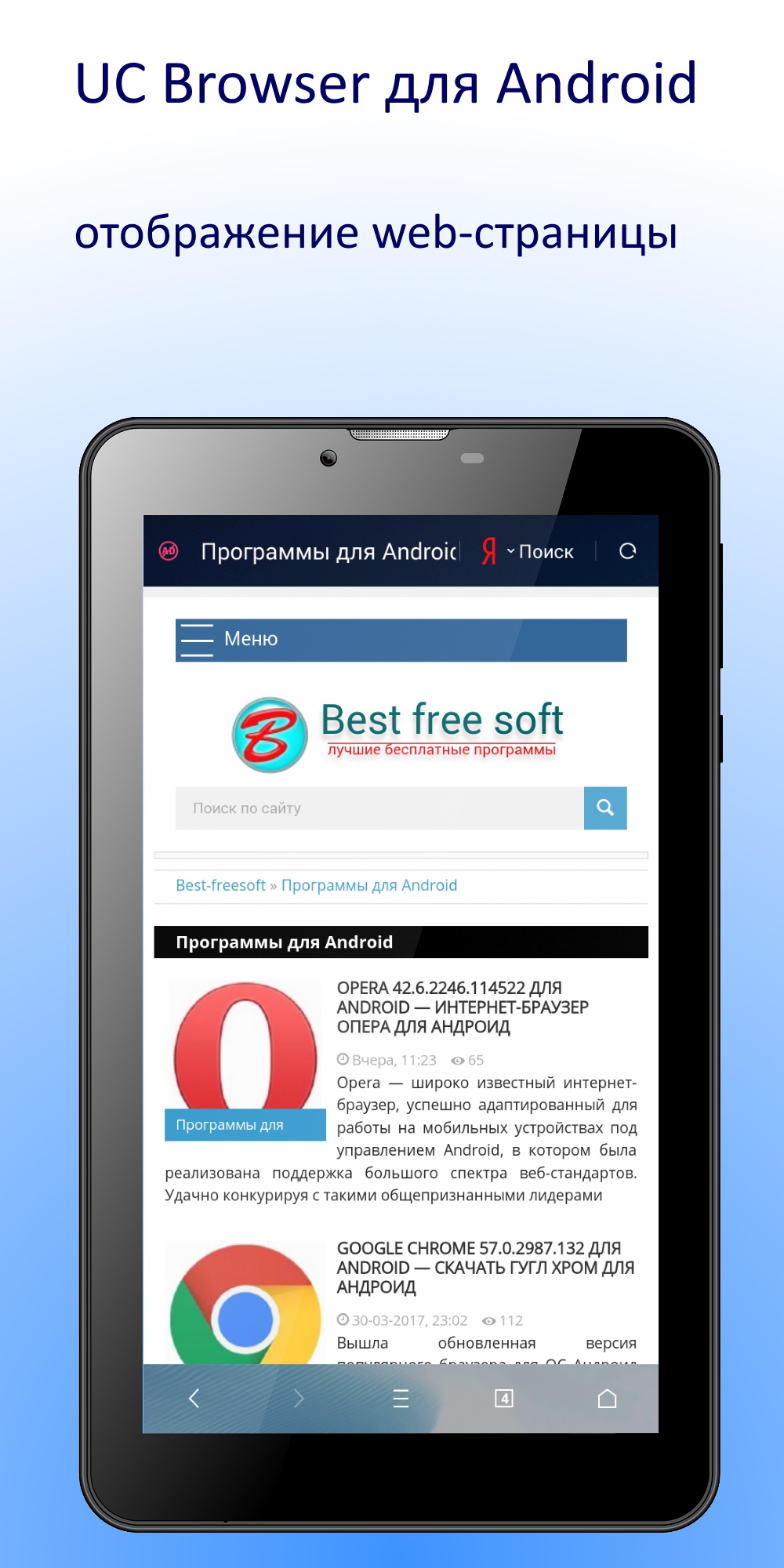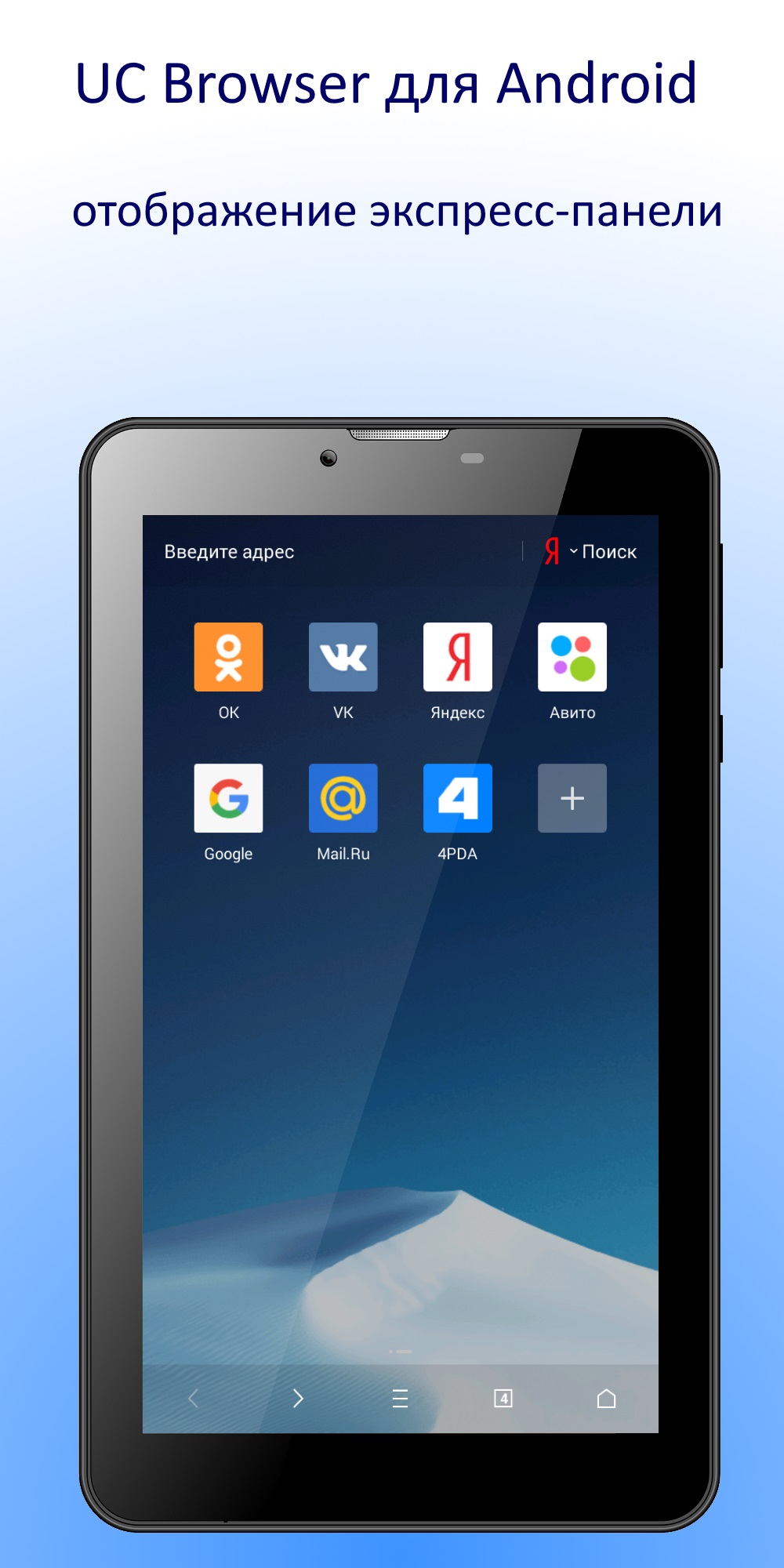 UC Browser для Android — бесплатный интернет-браузер, который является одним из самых быстрых среди браузеров для работы на мобильных устройствах под управлением ОС Android и обладает поддержкой функции облачной синхронизации. Имея широкий спектр функциональных возможностей, UC Browser не требователен к аппаратным ресурсам, а также может существенно снизить интернет-трафик, благодаря чему заслуженно признан лучшим Android-браузером.Следует отметить, что высокая скорость загрузки web-страниц браузером стала возможной благодаря использованию прокси-серверов для сжатия контента страниц и некоторым важным параметрам по оптимизации в пользовательских настройках, при правильном использовании которых можно добиться повышения скорости загрузки страниц в итоге в два раза. Помимо этого UC Browser приспосабливается к разным видам сетей. Специальная функция в автоматическом режиме подберет для вашего устройства наиболее оптимальную версию веб-страницы основываясь на типе и возможностях подключенной сети. Так же для экономии трафика в браузере реализована функция «Посмотреть позже», которая записывает всю информацию страницы на устройство, включая изображения и видео, для дальнейшего оффлайн-просмотра позже. Для комфортного чтения в темное время суток в браузере UC Browser реализована функция ночной режим: фон меняется на черный, а шрифт — на белый. А для изменения внешнего вида и увеличения функциональности в UC Browser поддерживается установка тем и веб-приложений, которые можно скачать с соответствующих ресурсов на официальном сайте.