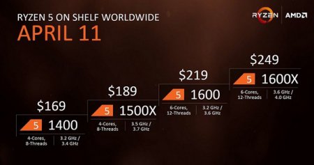 Ryzen 5 1600: 6 ядер/12 потоков, 3,2/3,6 ГГц, 16 МБ кэша L3, TDP 65 Вт, 219 дол.США;