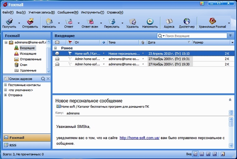 Foxmail — это бесплатный почтовый клиент, обладающий большим количеством функций для работы с электронной почтой под управлением ОС Windows. В программе имеются: поддержка макросов, настраиваемых шаблонов, диспетчер писем для их просмотра прямо на сервере с возможностью удаления, поддержка фактически неограниченного числа почтовых ящиков, установка пароля на вход в почтовый ящик, а также гибко настраиваемые правила сортировки почты. Оснащенный встроенным HTML просмотрщиком, Foxmail может не только читать полученную HTML-почту, но и создавать HTML-письма, в том числе с «графической» подписью. Поддерживается получение новостей в RSS-формате с опцией поиска, имеется и такая полезная опция, как анти-спам модуль. Совсем неплохо и то, что Foxmail, несмотря на многообразие доступных функций, является программой не только бесплатной, но и компактной.Основные возможности Foxmail: