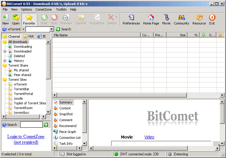 BitComet — программа, которая поможет вам скачивать файлы с BitTorrent сетей, HTTP- и FTP-серверов. Она характеризуется отличным дизайном, простотой в использовании, и при всем при этом абсолютно бесплатна. Программа поддерживает целый ряд дополнительных опций: предварительный просмотр файлов MP3, RealPlayerVideo, Windows Media Video и Quick Time перед их загрузкой, одновременное скачивание нескольких файлов, выбор частичной загрузки torrentа, который можно докачать после перерыва, выставление ограничения скорости загрузки и отдачи, встроенный браузер, модуль чата и т.п.Основные возможности BitComet: