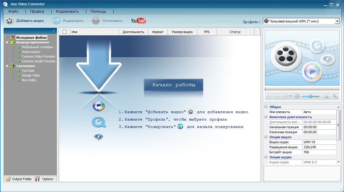 Any Video Converter Free — это бесплатный видео-конвертер для преобразования ваших видеофайлов в наиболее популярные форматы, с высокой скоростью конвертирования и превосходным качеством видео конечного результата. Обладая интуитивно понятным интерфейсом, Any Video Converter делает преобразования видео для пользователя быстрым и легким. Any Video Converter не ограничивается только конвертированием видеофайлов, в его арсенале возможностей присутствуют такие функции, как слияние нескольких видеофайлов в один, возможность скачивания для последующего преобразования с видеосервисов YouTube, Google Video, Nico Video, возможность задания для конвертирования лишь участка ролика. Any Video Converter позволяет конвертировать видео с форматов AVI, ASF, MOV, RM, RMVB, FLV, MKV, MPG, 3GP, M4V, VOB, YouTube видео (и многое другое) в форматы AVI, MP4, WMV, SWF, FLV, MKV, MPEG-1 и MPEG-2, MPG (PAL или NTSC), MP3, WMA, OGG, AAC, WAVE, m4a. Any Video Converter позволяет выполнять кодирование файлов с использованием как готовых профилей, с установленными параметрами видео, которые ориентированы на определенные устройства (бытовой DVD-проигрыватель, мобильный телефон), так и самостоятельно подбирать свои настройки конвертирования. Перед началом кодирования видео его можно просмотреть во встроенном проигрывателе.