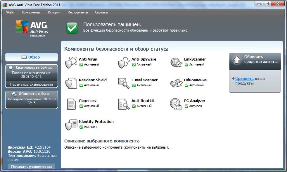 AVG AntiVirus Free — надежная, и в тоже время бесплатная защита от вирусов. Несмотря на свой статус FREE, AVG AntiVirus Free имеет в наличии все необходимые функции для защиты компьютера от вирусов. Антивирусная программа включает в себя следующие компоненты: сканер, монитор, сканер электронной почты, систему автоматического обновления антивирусной базы через интернет.Компоненты AVG AntiVirus Free: